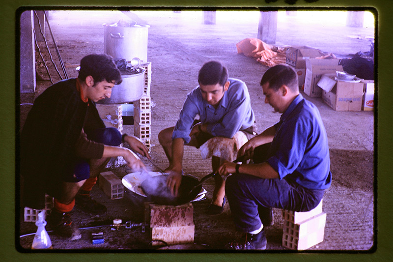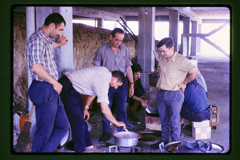 Pol-Pol-eko gaztetxoen akanpada: Gizon taldea lurrean jarritako su txiki batean janaria prestatzen. Altzasu elkarteko beheko solairuan, oraindik itxi barik zegoenean